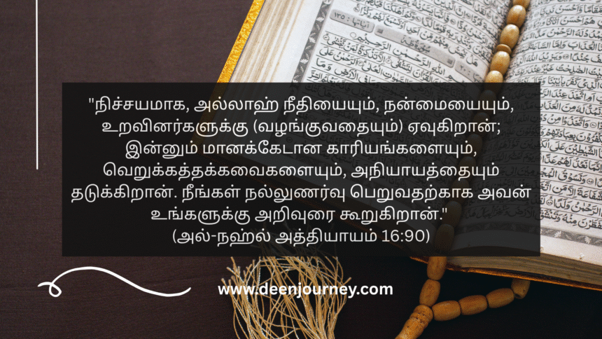“நிச்சயமாக, அல்லாஹ் நீதியையும், நன்மையையும், உறவினர்களுக்கு (வழங்குவதையும்) ஏவுகிறான்; இன்னும் மானக்கேடான காரியங்களையும், வெறுக்கத்தக்கவைகளையும், அநியாயத்தையும் தடுக்கிறான். நீங்கள் நல்லுணர்வு பெறுவதற்காக அவன் உங்களுக்கு அறிவுரை கூறுகிறான்.” (அல்-நஹ்ல் அத்தியாயம் 16:90)
