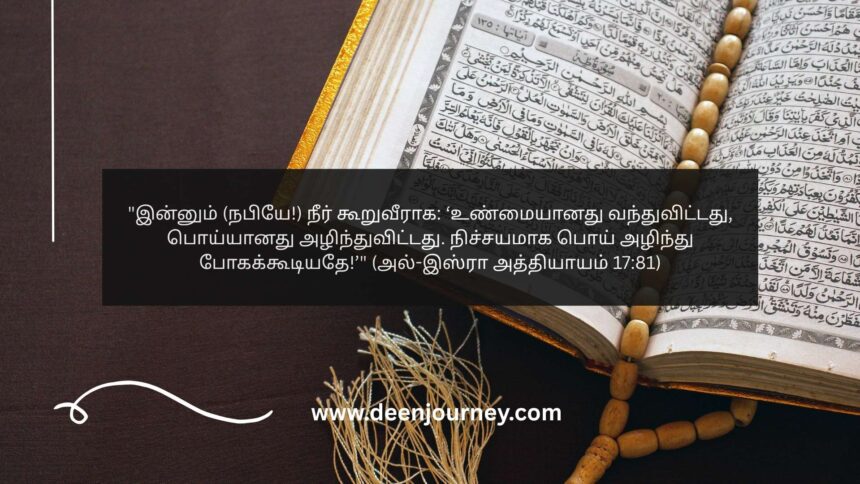 “இன்னும் (நபியே!) நீர் கூறுவீராக: ‘உண்மையானது வந்துவிட்டது, பொய்யானது அழிந்துவிட்டது. நிச்சயமாக பொய் அழிந்து போகக்கூடியதே!’” (அல்-இஸ்ரா அத்தியாயம் 17:81)
