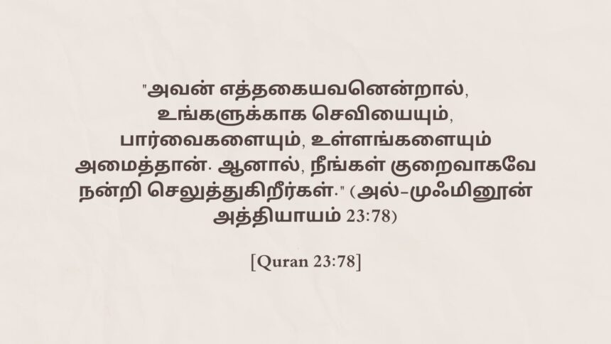 “அவன் எத்தகையவனென்றால், உங்களுக்காக செவியையும், பார்வைகளையும், உள்ளங்களையும் அமைத்தான். ஆனால், நீங்கள் குறைவாகவே நன்றி செலுத்துகிறீர்கள்.” (அல்-முஃமினூன் அத்தியாயம் 23:78)